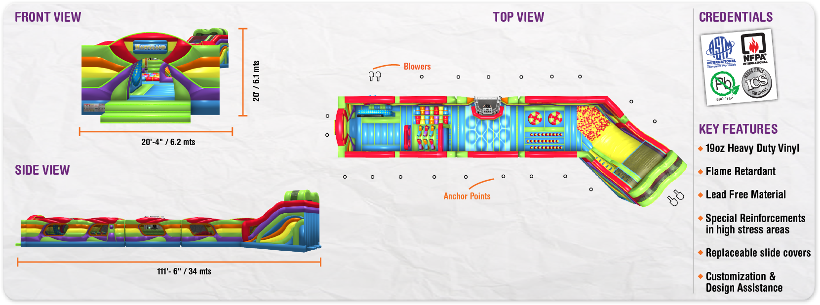 Length: 111'/ 34 mts Width: 20'/ 6 mts Height: 20'/ 6 mts